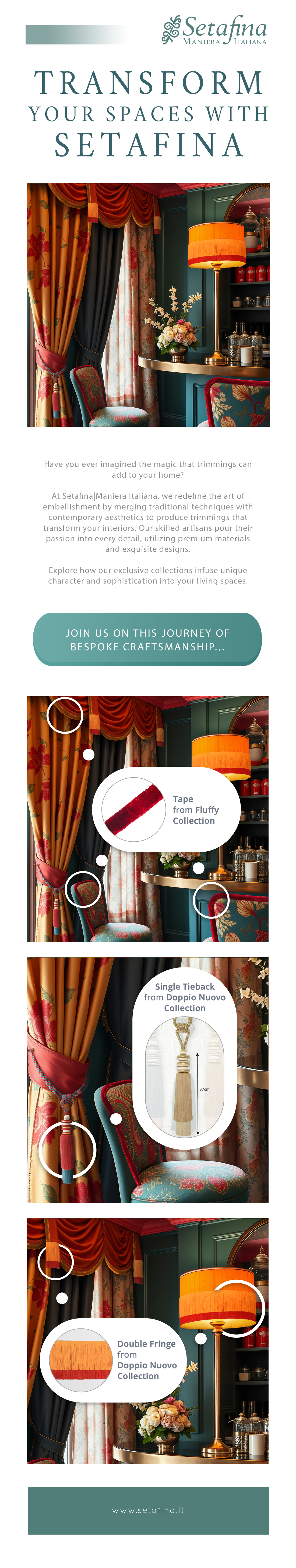 At Setafina, our unwavering mission is to revolutionize the trimmings industry by blending innovation, creativity, cutting-edge technology, and an unwavering commitment to eco-friendliness. Guided by this vision, our Custom Made concept sets us apart, as we are driven by a deep desire to provide an exceptional customer experience, allowing detail lovers to co-create personalized trimmings.